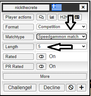 1) Είμαστε στη σελίδα "Main" και βρίσκουμε τον αντίπαλο μας2) Στην πρόσκληση που του κάνουμε (βλέπε φωτο) επιλέγουμε την ένδειξη "Speedgammon match" και 5 πόντους